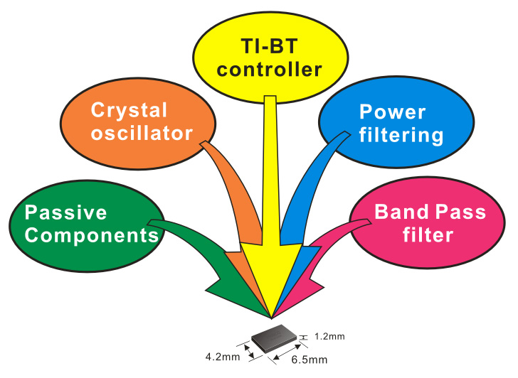 The miniature size Bluetooth 4.0 dual mode SiP module integrates TI-CC2564 BT controller, band-pass filter, crystal etc. Excellent RF performance ( Tx: power +10 dBm; Rx sensitivity -93 dBm) are realized by using Princo’s patented ultra high density substrate and advance packaging technology.