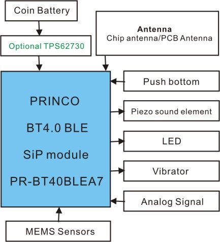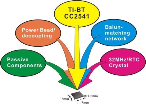 ¡@ ¡@ The miniature size Bluetooth 4.0 Ble single mode SiP module integrates TI-CC2541 BT controller, balun-matching network, crystal etc. Excellent RF performance ( Tx: power +0 dBm; Rx sensitivity -98 dBm @250kbps, GFSKare realized by using Princo's patented ultra high density substrate and advance packaging technology.